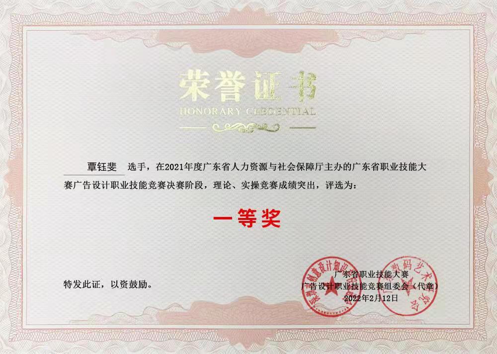 在近日广东省人力资源和社会保障厅公布文件中,我校创意设计学院覃钰斐老师在2021年广东省职业技能大赛广告设计职业技能竞赛中荣获一等奖,并被授予“广东省技术能手”荣誉称号。