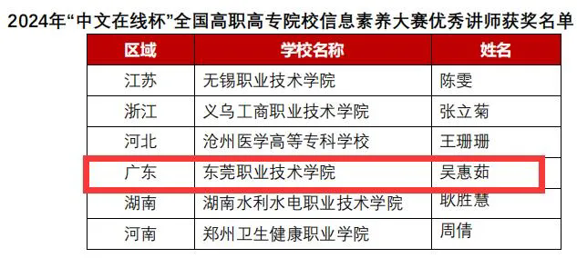 12月11日,2024年第六届全国高职高专院校信息素养大赛决赛顺利落幕,我校商贸学院2022级王熙来同学荣获全国二等奖,电子信息学院2024级李伟杰同学获广东省二等奖。同时,吴惠茹、侯君洁、黄珊老师荣获全国决赛“优秀指导教师”奖,吴惠茹老师荣获“优秀讲师”奖,我校荣获最佳组织奖。