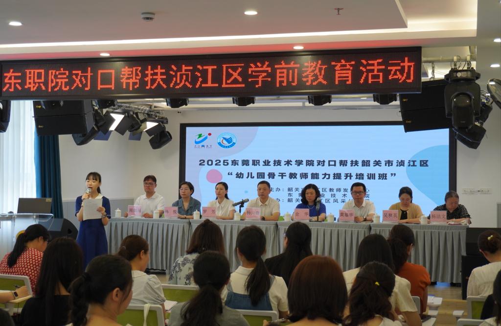 开班仪式上,余华对我校自2021年以来的教育帮扶工作表示衷心感谢,指出本次培训班的举办是帮扶浈江区打造一支“理念新、业务精、情怀深”教师队伍的又一重要举措。杨云奇表示,我校立足“浈江所需,东职所能”,以师资培训为抓手促进师资队伍优势互补、以联合开展科研项目为依托促进校地深度合作,推动莞韶两地教研共融和成果共享。随后,我校孙悦和何伊丽两位教师,分别以“家园沟通策略”与“儿童行为观察”为主题进行授课。