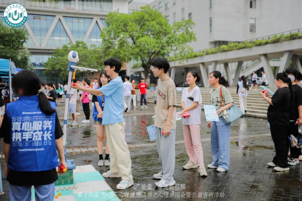 本次活动现场设置了心理知识科普区、游戏活动区、公益心理咨询区。心理知识科普区展示了各类心理健康方面的科普知识,吸引众多同学驻足观看。在游戏活动区,同学们手持心理游园卡,积极参加双龙戏珠、你画我猜、眼疾手快等游戏。